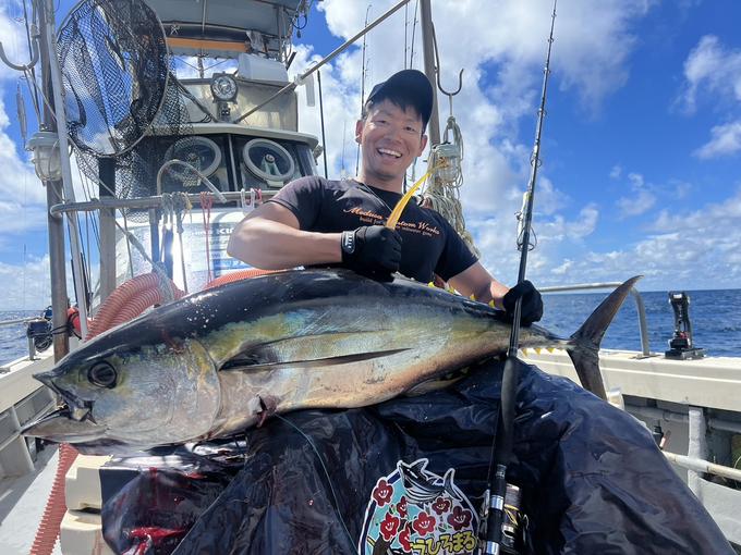 とても渋い状況でしたが誘い出しで 35キロのキハダ! 安心と信頼のTX8とカーボナイロンの 組合せでキャッチしました♪