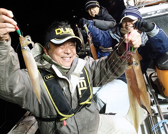 新年初釣り第二弾。イカメタルゲームで良型ヤリイカを確認したところで、周囲の皆さんと同じ浮スッテタックルに持ち替える。ヤリイカの浮スッテゲームでは、オモリをボトムにコンタクトさせ、仕掛けのフケを利用し浮スッテやプラ角をシェークし、ヤリイカを誘う“ハワセ”というテクニックを駆使する。全神経をボトムの仕掛けに集中し、極力ラインから余分なフケを出さぬように努め、感度確保とアクションコントロールの両立を目指す。そのためにも、今回使用のSuper X-wire™4 1.5号の細さと感度の良さはナイスバランスだった。当日はドテラ流しなので、ヤリイカの群れに遭遇すると、周囲の釣人が同時にバタバタとヒットする筈。案の定、隣に座る愛知の友人2名と一緒に3連4連を連発する。この釣れっぷりで今シーズンのヤリイカのコンディションを占うのが、今回のプラの目的。当日は、半夜釣りながら船中一人平均30尾を超えるという大爆釣で、好調のシーズンインを確認することが出来た。