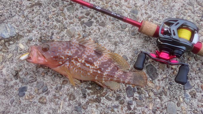 今回は舞鶴方面でアコウ(キジハタ)と遊んできました。フグの数が多くてソフトルアーは噛られまくりで、プラグとメタルジグのゲーム展開でした。マイブームのLGヘビーミノーは安定の釣果で、ボトムまで沈めて、クリクリと2、3回程巻いてのフォールでゴンと強いバイトで楽しめました。