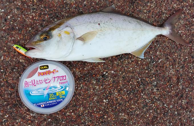 魚に見えないフロロピンクの実力を図るべくマイクロショアジギングへ行ってきました。 ターゲットは目の良い青物。ポイントも人の多くプレッシャーの高い釣り桟橋。5gのジグでボトムまで落としじゃくり上げるとすぐにシオがヒット。シーバスロッドだったので途中桟橋の柱に軽く巻かれましたが魚に見えないフロロピンクリーダーは根ズレにも強い。その後6本追加し魚に見えないフロロピンクの効果と強度を確認することが出来ました