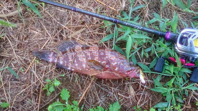 舞鶴方面のアコウ(キジハタ)です。手前の目に見えるポイントはLGヘビーミノーを使いますが、沖目を探るのは、ソリッドバイブが良い感じですね。