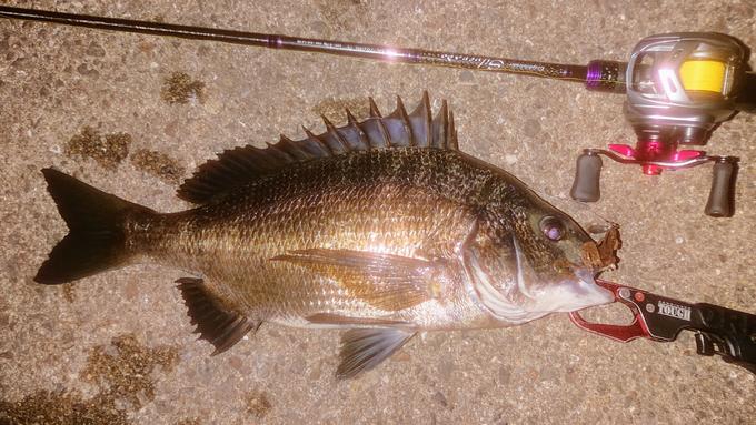 大阪港でチヌを狙ってみました。岸壁をフォール主体で探る岸壁チニングです。5g直リグにホッグ系ワームで狙って43cmのチヌをGET!着底直後のワンアクションでのバイト&ヒットです。