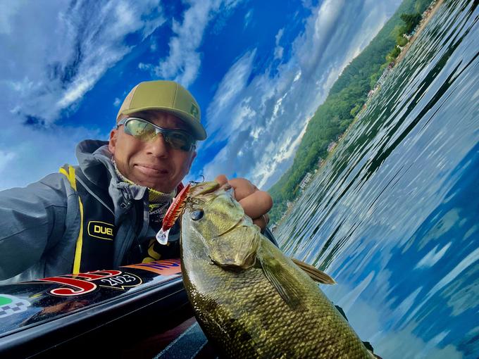 減水の野尻湖。シャローはほぼ撃沈。8から10mのフラットエリアにワカサギ群が多く、メインエリアに。ただ、バスがやや浮きぎみで活性が低い時は、Lバスシャッドのドラッキングで水面下3.4m付近をジャークで。スイッチがはいりバイトへ!