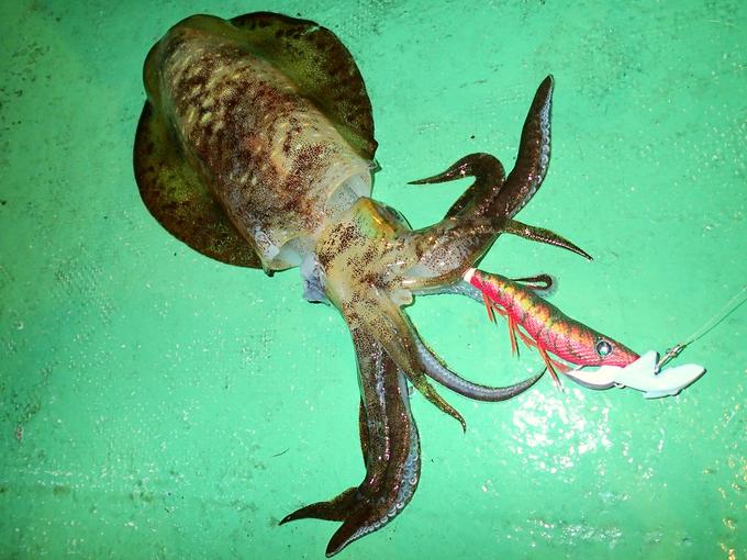 ナイトティップランで乗りが渋いときのアクションのひとつが、エギのサイズダウン。イージーQキャスト喰わせラトル2.5号LFMでしっかりアオリイカを確保しました。