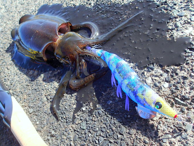 澄潮の日中エギングでアオリイカの反応は激渋でしたが、澄潮時の警戒心の強いイカをしとめるシステムカラー’すみ潮ブルー’をチョイスしたら、期待どおり気持ちよくヒットしてくれました。
