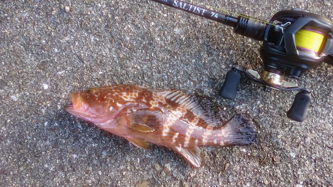 淡路島のデイゲーム釣行で釣れたアコウ(キジハタ)です。大阪湾では放流をしている魚で、放流効果も有り近年徐々に増えてきましたね!