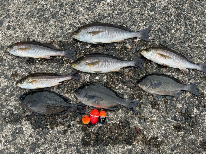 イサキ狙いで加部島の新波止で竿を出した。 7:30実釣開始。潮は大潮だが、いい感じにゆっくり沖に出ている。まずは上層からピースマスター遠投2B・2ヒロでスタート。しばらくすると、20〜25センチ前後のグレが10匹程度食ってきた。 しかし、今日のターゲットはイサキ! ウキをウェーブマスター1号に変更。ウキ下を竿1本に調整し、グレの下の層を探るも、フグも猛攻に。 最終手段でウキをポートマスター1.5号に変更してウキ下を竿2〜2本半に変更。すると1投目から25センチの本命イサキが食ってきた。その後、25〜35センチのイサキを4匹追加して釣行終了。思った通りの釣果に満足した釣行となった。ポートマスターを初めて使用したが、形状が大きく視認性に優れており、ウキを一気に消し込む魚種や、波止・防波堤での釣りには最適。今後も水温が急激に下がらなければ、イサキは安定した釣果は見込めると思います。