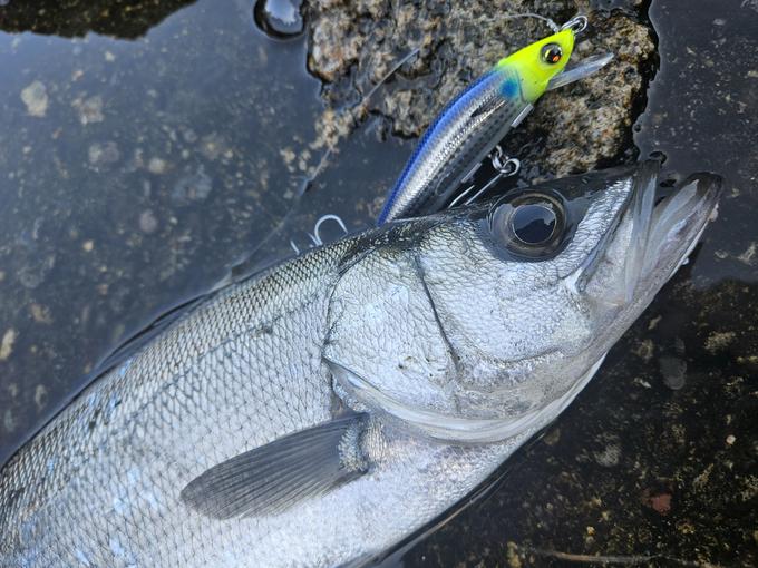 こんにちは!関西でもちらほらと桜が 咲き始めたので波の残る和歌山は那智勝浦の沖磯へ ヒラスズキ釣りに行きました! ウネリが強く、濁りも激しかったので しっかり水を噛んでアピールできる アイルマグネット105Fで朝イチに銀ピカの 綺麗なヒラスズキがヒットしました! これからのシーズンは産卵を終えたヒラスズキが 接岸するので派手めなアクションでも 勢い良く食ってきてくれるので、アイルマグネットシリーズが活躍します!是非お試しあれ♪