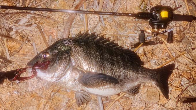 14日夜も淀川チニングです。干潮のタイミングでしたが、46cmのチヌがヒットしました。5g直リグのボトムズル引きです。