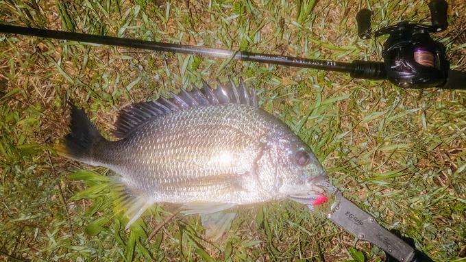 29日朝、夜明け前の釣果キビレ41cmです。今の淀川は、水が澄んでいるので暗い時間帯の方が釣果は出しやすいですね!バイブレーションルアー、ソリッドバイブのリアクションメソッドが効きます。