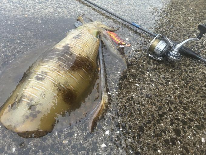 今日は朝から雨。 ポイントへ到着すると先行者はなし。 ラッキーと思いながらお目当てのポイントからスタート。 パイロットエギはアオリーQマグネットSSマズめオレンジ 幸先よくシャローエリアでまずは600gをキャッチした後に、沖の潮目にベイト発見。この時点ではヨーヅリアオリーQ3.5号藻場ブラウン。この一投目に「ジィー」と一気にエギをひったくっていくという、一番ハラハラ、ドキドキのやつ。しっかりとおい合わせを入れ、上がってきてくれたのは1.6キロのアオリイカでした。