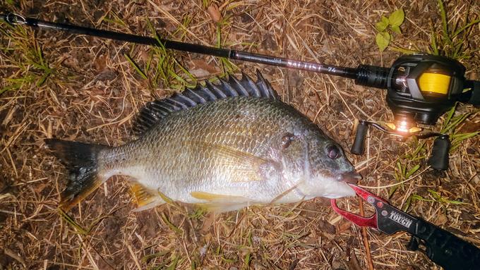 画像の魚は地元、大阪港のキビレ38cmです。淀川の影響なのか、真チヌよりも汽水域を好むキビレの魚影が濃いのが大阪港です。特に、浅いポイントでヒットするのはキビレ率が高いですね!