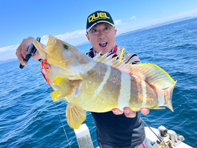 先程のつづき…DUEL開発統括の小松氏との五島沖への鯛ラバーゲーム釣行ですが、当日が潮がゆるゆるで効かず魚の活性も低くて激シブモード…そんな中、ヤマト遊船の船長さんが色々と考えて可能性のあるポイントを隈なく案内して下さって…次に来たのは45cm超のごん太なアオナ(アオハタ)でした♪ヌルヌルなので毛嫌いするアングラーもいるみたいですが、キャッチ&イート派のオイ的には美味しいターゲット!有り難くお待ち帰りさせて頂きました♫つづく…