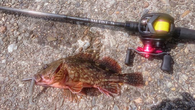 舞鶴で釣れたガシラ(カサゴ)25cmです。太陽光ガンガンの日中でのヒットです。水色は澄んでいた感じのなか、ステルス性の高いピンクフロロのライン特性が効いたヒットでした。