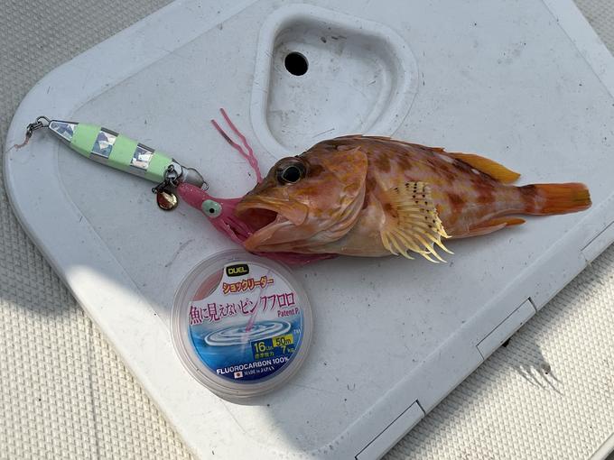 TEAM RISEでのSLJ釣行…PE0.8号にリーダー16lbs.、タングステンジグである程度の主だった獲物をキャッチしたので、少し強めのタックルにDUELが生んだルアー型インチクのソルティーベイトを使用してボトムを狙い撃ち!思惑通りに喰って来たのはウッカリアラカブでした♪つづく…