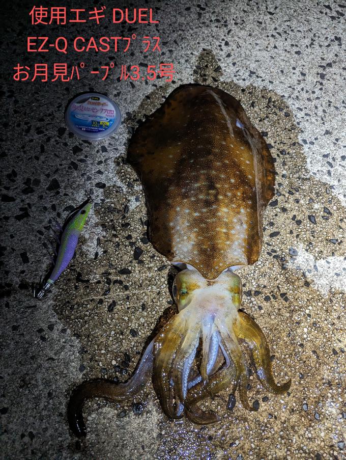 月夜でのナイトエギングで、お月見パープルを使用したらイカパンチの後、エギ抱いてくれました。
