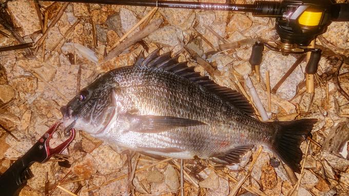 淀川でチヌを釣ってきました。風が強く、少し釣り辛かったのですが、5gJHワームで40cmが釣れました。ルアーアクションはボトムバンプで、強めに跳ね上げると喰ってきました。