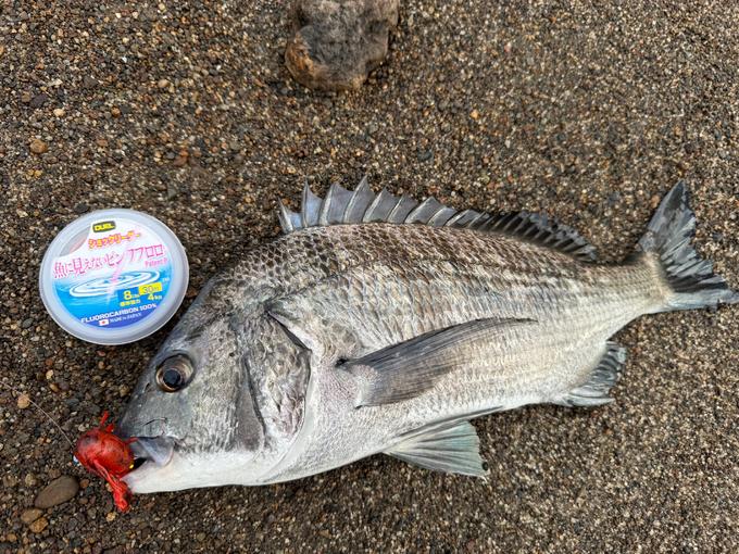サイトでクロダイを見つけフリーリグでアプローチ。ピンクフロロのお掛けでバイトの瞬間まで見えました!