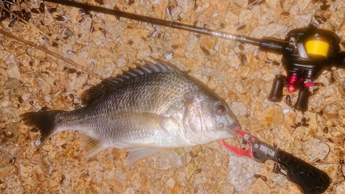 午前は日本海に釣行していましたが、夜は地元、淀川でチニングです。雨が降り出す迄の短時間釣行でしたが、キビレが遊んでくれました。ヒットパターンは3.5gJHに2inワームをボトムで跳ね上げてのリアクションバイトでした。