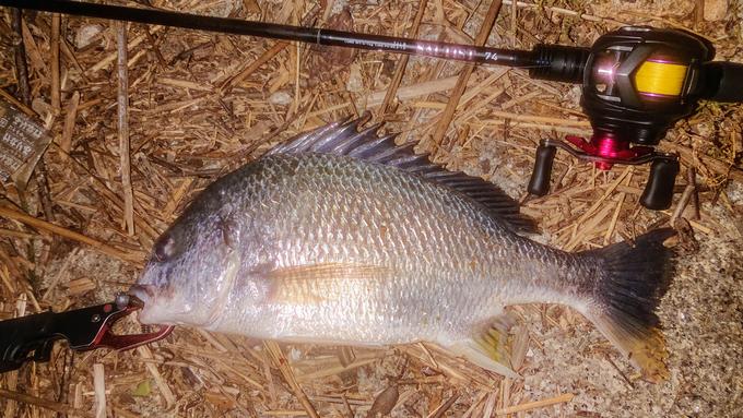 日没後の淀川でキビレを釣ってきました。5gJH+3.5inワームをボトムで跳ね上げてのリアクションバイトを捕りました。37cmの満足サイズです。