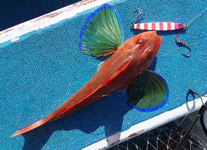 良型寒ザワラの美味しいお土産確保をすませたところで、根魚狙いに作戦変更。タックルをスロージギング用ベイトタックルに持ち替える。ボトムに着底したジグをロッドの反発力を利用してスローにジャークし、その後のフォールでスライドアクションを入れる。このフォールの途中でSuper X-wire™8の細ラインが抜群の感度でカツカツッという微妙なアタリを伝えてくれる。このアタリを間髪で合わせれば、ロッドは文字通り満月に曲がった。そして、グングングンというファイトを楽しみながら上がってきたのは。色鮮やかなホウボウだ。これまた美味しい獲物に思わずガッツ。真冬の根魚は当分楽しめそうだ。