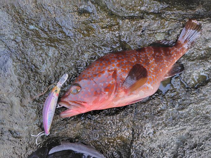 水温の上がりキジハタの活性も高くなってワームのボトム狙いよりスイミングに反応が良くなってきたのでこれはハードルアーの方がアピールが高く釣れるんじゃないかと言う事でハードコアヘビーミノーでキジハタを狙ってみるとコレが大当たり!!フルキャストしボトム近くまで沈めた後はやや早めのリトリーブでドン!!躊躇ないバイトでキジハタ2桁釣果!!ハードコアヘビーミノーってもしかしたらワームより釣れるかも。
