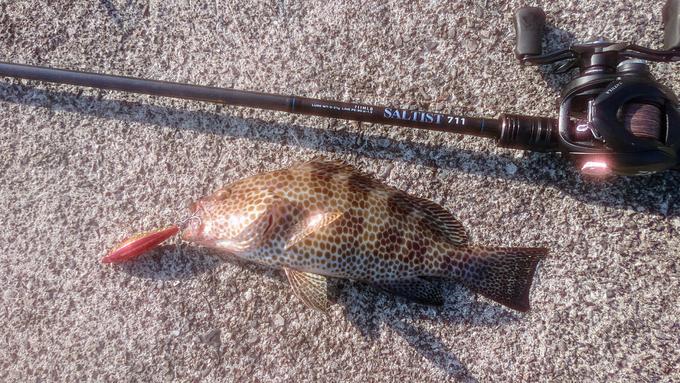 尾鷲方面にオオモンハタを求めて釣行しました。漁港等の足場が良い所での釣りで、小型でしたが多数釣れました。画像はモンスターショット65にヒットした魚です。