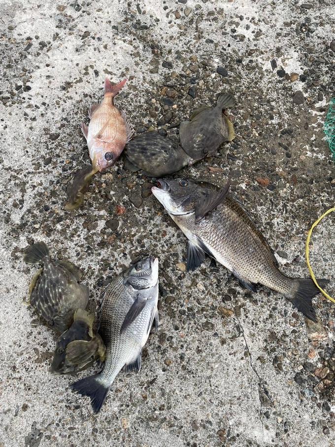 松山市の沖合にある睦月島の浮き桟橋での釣果。午前中はほとんど釣れず、撒き餌が効き始めた昼頃からポツポツと…。とにかく餌取りが多く、本命のチヌの姿は全然見えない。棚は竿一本くらい。刺し餌は、ネリ餌&加工オキアミ、コーンなどのローテーション。加工オキアミに良く当たった様子。