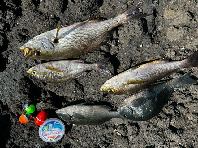 加唐島エリア(松島)の小松島へ渡礁した。 日が登ると釣果が落ちることが分かっているため、急いで準備を行い、5:30に実釣開始するが、潮が全く動かず当たりが出ない。状況変わらず、時間が経過し、日が登るとエサ取りのスズメダイと小イワシが海面を覆い尽くす。 潮が動かないこともあり、マキエで分離することができず、沖(30m先)までがエサ取り状態となり、お手上げ状態に。最後の一手で更に沖を狙う作戦でウキをピースマスター遠投00Lに沈下速度を上げるため、ガン玉で微調整を行い、約50m先に遠投する。この仕掛け変更と作戦が的中。何とか狙いのイサキ3匹とグレ2匹を釣り上げることができた。ピースマスターは思った以上に遠投できます。
