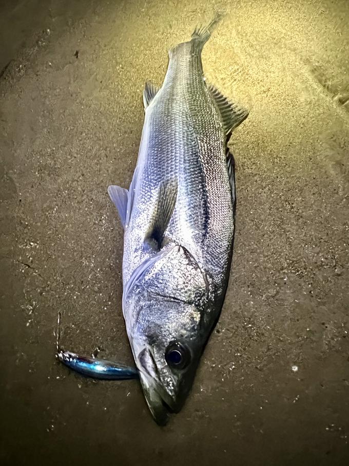 絶対にキビナゴがいない上流域での釣り! ヨレに差し掛かったときにルアーが横に暴れて、ドスン! いいサイズのシーバス釣れました!
