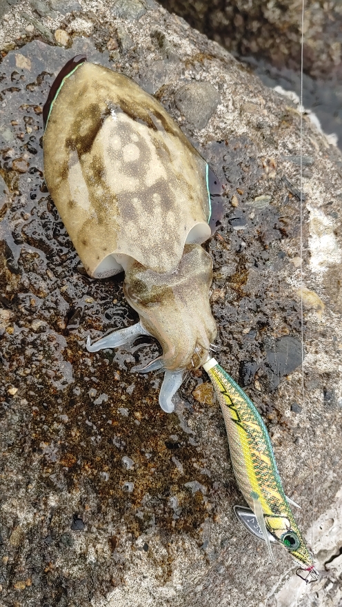 お昼過ぎ、干潮から上げ潮に代わるタイミングで出掛けましたが、潮がめちゃめちゃ低かった。 ここ数年で1番キレイにアタリを取って、アワセもバッチリ決まったけど、釣り上げたのはコウイカ…しかもちっちゃかった(笑) なので海にお帰りいただきました。