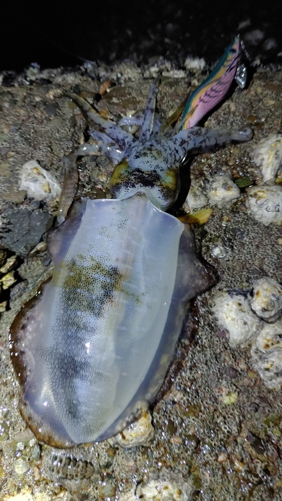 この日は子供の運動会があり、ド干潮覚悟で時間限定の出撃! 潮が止まる前に、何とか1杯・・・今シーズンの最大サイズを更新することが出来ました。 アオリイカ、来てくれてありがと!