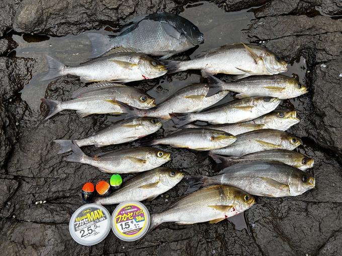 先週に引き続き、同じく加唐島エリアへの釣行。加唐島の隣に位置する松島の大岩に渡礁。今回の狙いは、グレとイサキ。朝5:00実釣開始。先週の釣行では、エサ取りが激減していたこともあり、広範囲に予めマキエを打ち、魚を寄せる。すると1投目からイサキが食ってきた。その後、コンスタントにイサキを追加していくが、グレが食って来ない。干潮10:00に足元に潮のヨレが出てきたので、すかさず仕掛けを投入。すると、狙いのグレ(25㎝前後)が食ってきた。納竿まで9枚のグレを釣り上げたが、サイズが伸びないので、仕掛けをウェーブマスター1号に変更してコッパグレの下の棚をダイレクトに攻めて見た。すると一気にウキが消し込んだ。今日イチの引き!上がってきたのは32㎝のグレ。思い切って仕掛けを変更したことが良い結果に繋がった。今後、水温がもっと下がれば、良型グレが期待できると思います。