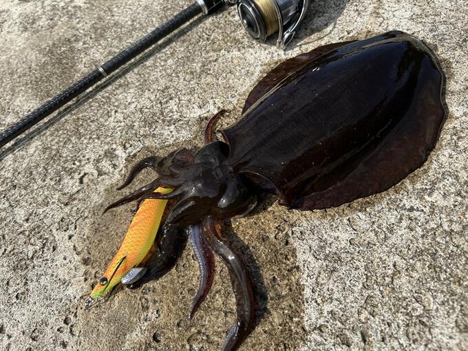 今日のパイロットエギは新製品のEZ-Q喰わせスロー3.5号リアルイソスジエビ 波止の先端の基礎石周からスタート。上げ潮が効きはじめ時折ベイトフィッシュの回遊も活発になり、いい感じだなーと思っている矢先、「トンッ」とあたりが入る。上がってきたのは300gの本命のアオリイカ。そしてお次は早く使ってみたかったアオリーQスロー3.5号。カラーはアピールチャートをセットしてキャスト開始。港内側の水中の明暗部へエギを送り込む。この時期でもラインが「スーーーと、走っていく。」気持ちの良い合わせと同時に重量感がまた最高。沈下速度はそれぞれ約6秒と5.5秒、思わず手を出してしまう沈下速度がたまらないですね
