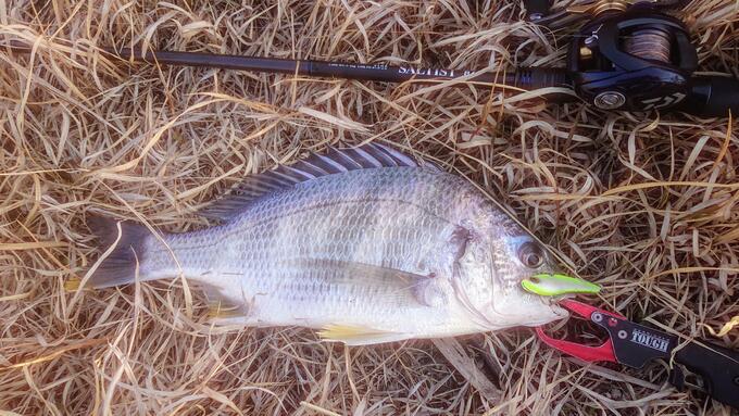 夕方に少しだけ淀川に釣行しました。砂地が多いポイントで、ソリッドバイブ65にヒットしたのはキビレでした。夕マズメに回遊して来た感じの魚です。