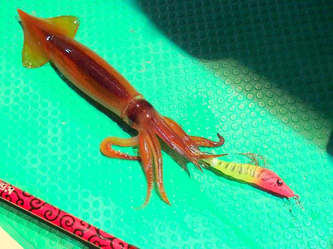 ヤリイカが終盤、ムギイカが開始の端境期。日むらが大きく、かなりタフコンディション。イカメタル開始早々、目の前にはイルカが回遊しはじめ、激渋が予想されるスタート。イージースリム布巻80mmからスタートするも、アタリが小さくなかなかイカが乗らない。で、近日中発売予定のイージースリム布巻70mmを、インプレを兼ねて装着すると、先ほどとは違う、アタリがロッドの穂先に表れる。シーズン初お目見えのムギイカだ。これを皮切りにしばし、ムギイカのヒットを楽しみました。