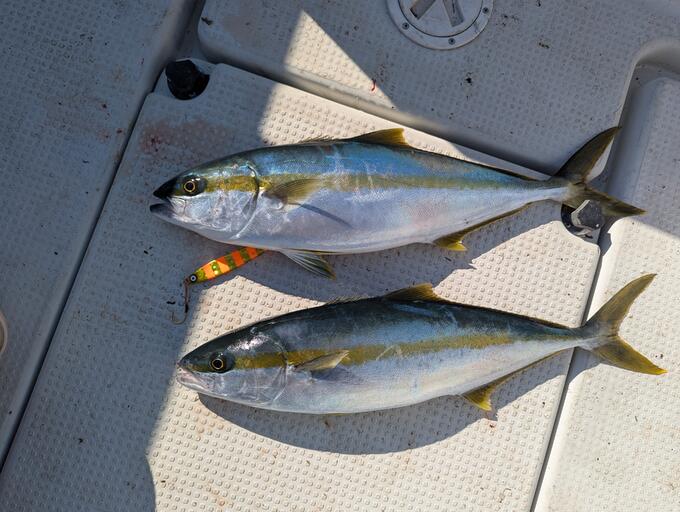 魚探に青物反応が出たので、鯛ラバタックルにブランカを付けて、早巻きアクション… ヒラマサを連続でGET♪