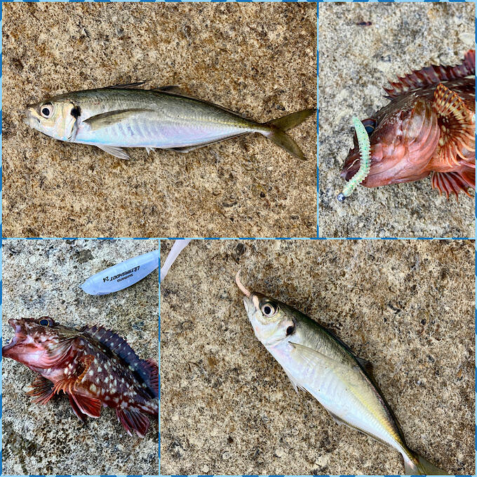 今シーズン初物のアジが夕まずめに釣れました。尺オーバーが2匹でした。その後はカサゴばかり…