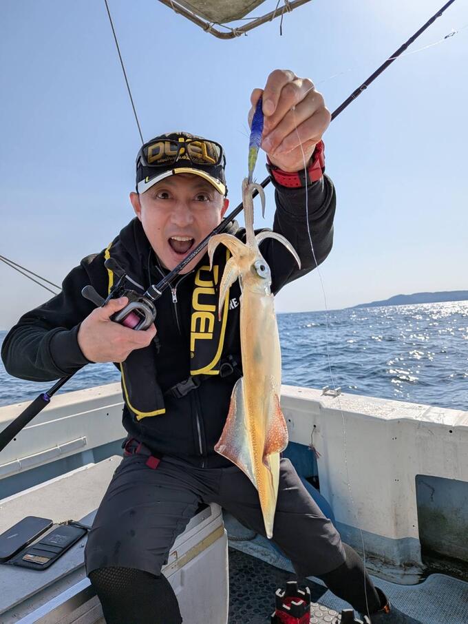 先ずは1パイ釣ったものの…昨日とは打って変わっての激シブモードで、「昨日は釣れたのに今日は釣れないパターン」に見事ハマってしまい船長も頭を抱える状況でしたが、ヤラん事には始まらん!って不屈の闘志で釣り続けると、これまた専用ロッドの竿先に微かなアタリを感じ、ワンタイミング置いてアワセを入れたらさっきとは違う重量感…途中でフッ!と軽くなって「えっ?もしかしてバレたのっ?」って思いつゝ…巻き上げて来たらドロッパーにサイズアップのヤリイカが!…このサイズの引きじゃなかったのに…って思ってメタルスッテを見たら、大剣サイズに近かろうイカのゲソが着いてて…ジェット噴射での見切れバラシか?私が巻きが強引だったからか?痛恨のバラシで、少し活性が上がって来たなっ!って思い釣り続けるバシケンでしたとさっ♪…つづく…