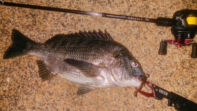 淀川のチヌです。5gJHワームで、ボトムを転がす様に探ると喰ってきました。