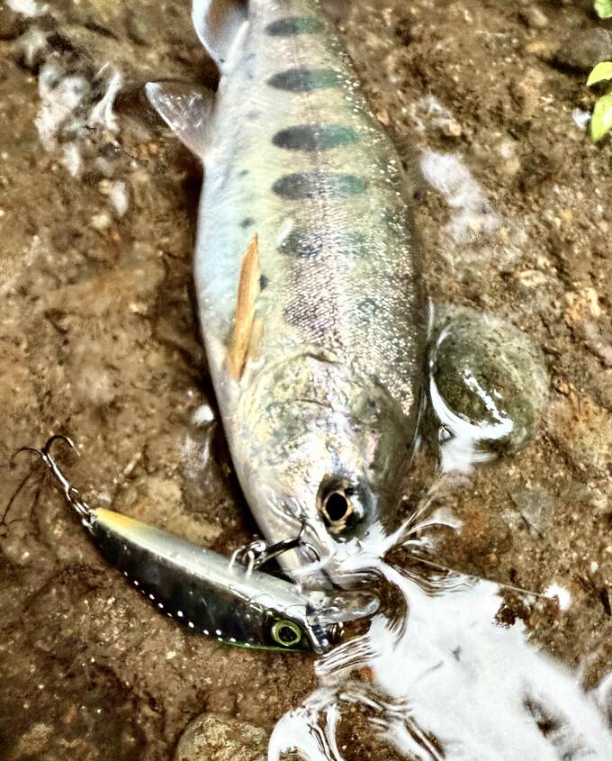 少し増水気味の河川へ! ヘビーフラットを使って丁寧に攻めていくと後ろから魚影が見えて、バイト! やはりヤマメは綺麗ですね!