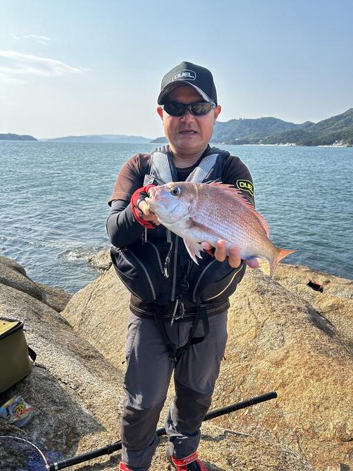 高松の沖磯で真鯛が好調との情報を聞きつけ、庵治漁港から出船している渡船を利用して、稲毛島の灯台下に渡礁した。船長のアドバイスに従い、棚を竿1本半(水深約11mで7m付近の棚)ピースマスター遠投3Bをセットして6:30に実釣開始。セオリー通り手前から探っていると3投目にウキに反応が出るも上がってきたのはベラ。この魚で狙いの棚に達していることは確認できた。船長ができる限り沖を狙うようにとのアドバイスを思い出し、4投目からは20m沖に遠投した。すると一気にウキが消し込んだ!合わせてを入れると真鯛特有の引き!タモに収まったのは食べごろサイズ(40㎝)の綺麗な真鯛だった。このパターンで25〜30センチ後半の真鯛を4匹追加して納竿とした。漁港近くの渡波戸では量型のチヌが多数釣れていて、チヌ、真鯛ともに好釣果がしばらく続きそうだ。