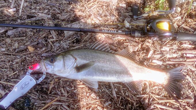 淀川でバイブレーションゲーム!流れが速くて、20gのソリッドバイブ65がメインルアーになりました。数キャスト毎にスナップとフックに付くゴミに苦労しましたが、流れのヨレでシーバスがヒットしました。