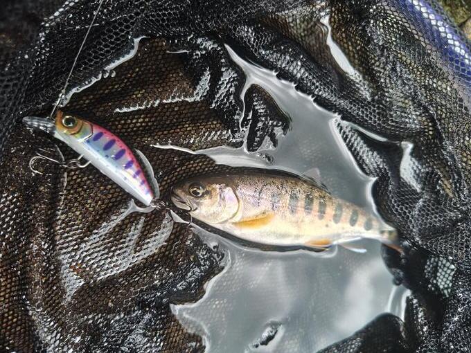 昨日のリベンジで再度沢登り!!落ち込みにキャストしてストレートリトリーブでヒット!!フラットボディのフラッシングが効果的でチェイス多数!!数年前振りの山の女王は小さくてもパーマークが綺麗でした。