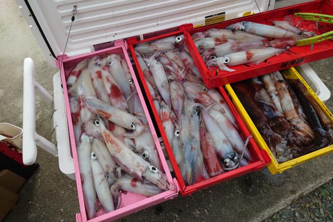 ケンサキイカ釣りに行って来ました、スルメをかわしてケンサキイカを釣りました、COLORローテーションしながらまずまずの釣果、ウネリが終盤きっく踏ん張るのが大変でした、ケンサキイカこれから本番戦又行きたいと思います