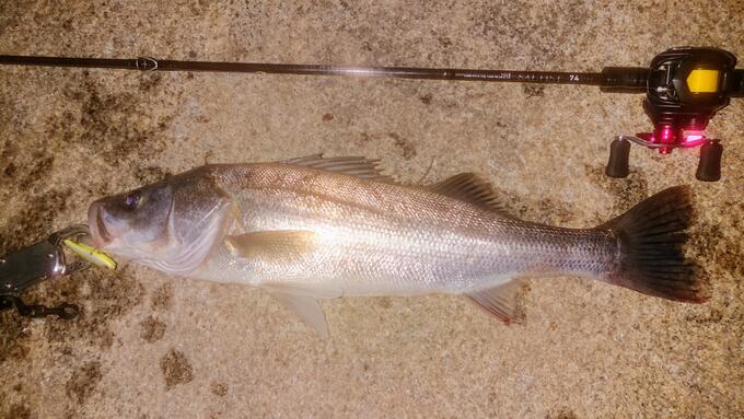夜の淀川で、バイブレーションをキャストしていたらヒットしたシーバス60cmです。ヒットルアーはソリッドバイブ55PCLでした。ソリッドバイブ55のサイズ感と重さが丁度良いですね!