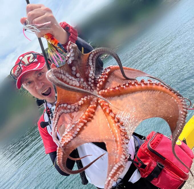DUEL開発統括のタコ松さんこと小松さんとの陸っぱりオクトパッシング…2匹目のマダコを狙って撃ってると、沖目のポイントで根掛かりが多発するので、5mぐらい先のシモリ根を狙って斜めに通して探っていると…シェイクして引いて動いて来ていたタコやんの動きが、ヌメッ!っと鈍くなる前アタリを感じたので、更に強めにシェイクを入れてしっかり抱かせて、難なくブリ揚げたのは1kgに足らないオスのマダコでした♪前アタリが出て、オクトパッシングの基本的にしっかりシェイクさせてガッツリ!抱かせたので、カンナが脚の根本に掛かっていて完璧の誘い、アワセからのキャッチ!でバッチグー!でした♫つづく…