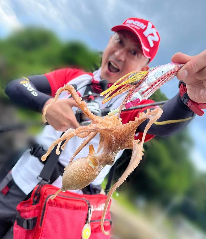 DUEL開発統括のタコ松さんこと小松さんとの陸っぱりオクトパッシング♩ラストのポイントで以前、3.52kgのクラーケンをキャッチしたポイントに似てる地形だったので、シャローのシモリ根をサイトオクトパッシングで丁寧に探っていると、見えていたタコやんが見えなくなったので、これまたシェイクを入れてしっかり抱かせてアワセを入れて…竿を上げたらピョォ〜ン!って飛んで来たのは、可愛いスナダコちゃんでした♪小松さんとこの地形はスナダコのポイントっぽいですね!って話しし乍ら釣ってて、その通りのスナダコキャッチ!の結果で大満足!スナダコはイカメタルの時にも釣れる小型のタコで、よくイイダコと間違えられますが…イイダコよりもやや大きくなり、頭(胴)の部分がイボイボした感じで、イイダコにある両サイドの金色の凛紋が無いので、その辺で見分けたら良いかと思います!皆さんも是非!ヨーヅリ・タコやんを使って…夏の釣りのオクトパッシングを嗜まれてくんしゃいなっ♬