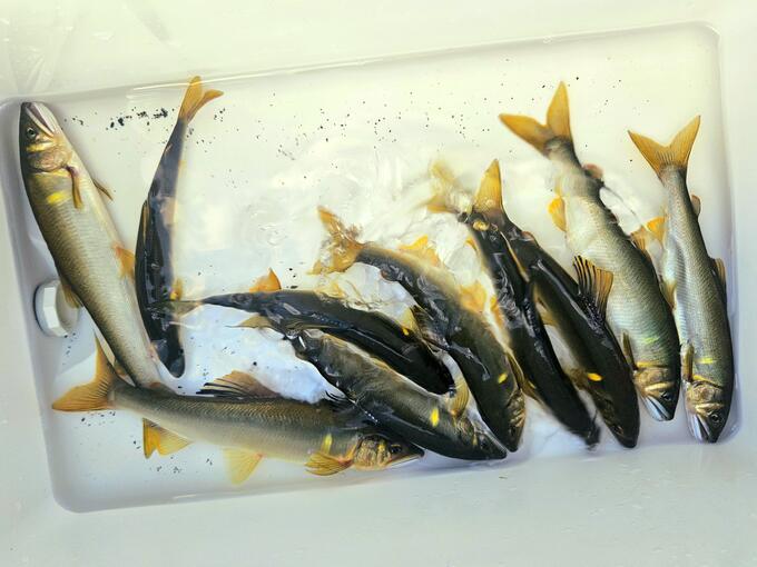 7月から日照り続きで超渇水の河原、人出の絶えた夕刻2時間、水中糸はアーマード® FH 鮎 水中糸 0.06号 GYB、ハナカン回り糸は魚に見えないピンクフロロ™ ショックリーダー 0.8号 SP、3本イカリのハリスは魚に見えないピンクフロロ™ ショックリーダー 0.8号 SPで、静かに泳がせ釣りをすれば、快調に黄色い野鮎がヒットしました。