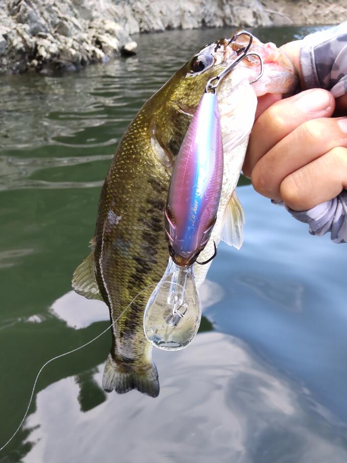 ここ最近の暑さと雨不足の影響で水位が先週に比べて2mも減水しちゃいましたね。 この先も雨予報が無いので、ちょっとマズイ予感が… そんな状況ではありますがバスは好調に釣れており、今回はジグストでナイスサイズをキャッチ! コイツは垂直岩盤の水深2mぐらいを泳がせていたらロッドを持っていくほど強烈にバイト!当然ジグは丸呑み!このワイルドな感じがたまりませんね。 また、岩盤エリアをラトゥールクランク2+、4+で狙い複数のバスをキャッチ! 今回は岩にぶつけた時のポーズやリトリーブスピードに緩急を入れた時のバイトが多く、水深4mまでをカバーできる4+の方がサイズ、数共に良かったですよ。